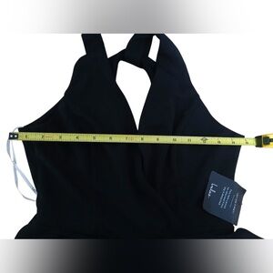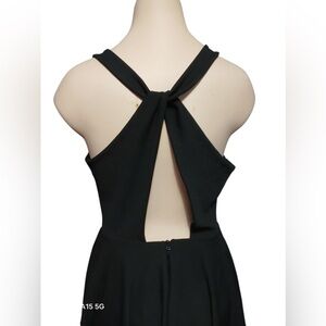 Chic black dress with a backless design. Features a sleeveless cut and flared skirt. Perfect for stylish outings.