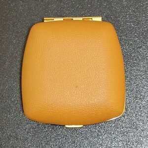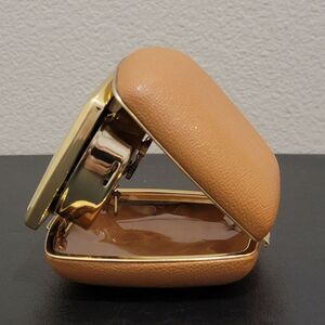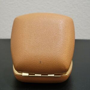 Vintage Linden Tan / Brown Clam Shell Hard Leather Case - Wind Up Mid Century Modern (Brass colored frame face) Travel Alarm Clock. Made in Japan.