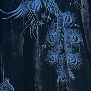 • Embroidery: Bird in flight on back, florals and peacock plumes throughout