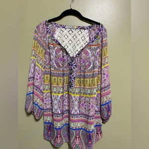 Reversible Bombs Away jacket from Lululemon in what I believe to be a size large. Chest measures 46 inches and length from shoulder to hem is 23 inches. Full zip front. One side is white and one side is a mottled gray. Each side has two pockets in the front. Cuffs and waistband are elastic, and it has a high neck.