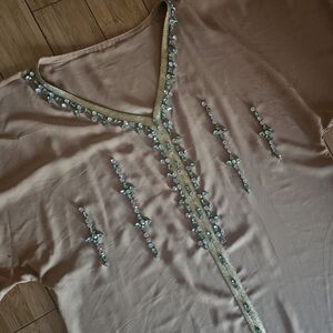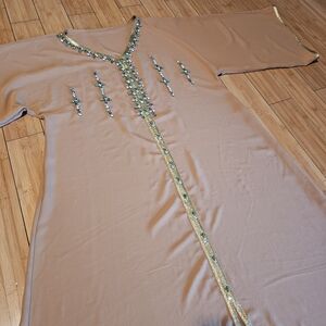 This stunning tan kaftan dress features exquisite green and clear stone embellishments and gold filigree piping detail at every seam, perfect for any special occasion. The elegant design and intricate details make it a standout piece in your wardrobe. Kaftan, mumu, draped, Indian, Moroccan,
