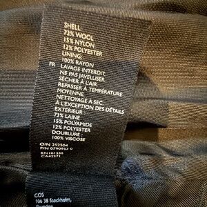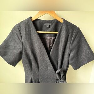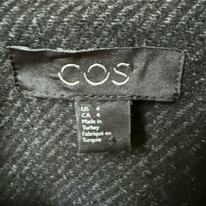This is a fun and flirty tie up wrap dress by COS in a size 4. Lined. Wool nylon and polyester with a rayon lining. Excellent condition with no known flaws. Dry clean. It is a dark gray with diagonal stripes.