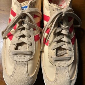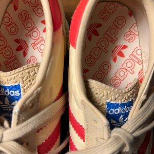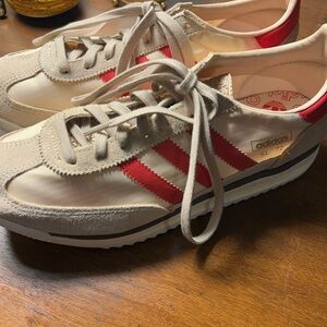 Chic Adidas SL 72 sneakers. Cream base with striking red accents. Ideal for everyday wear. There’s have a size 9 tag but I ama TRUE size 10 and they fit perfectly on me.