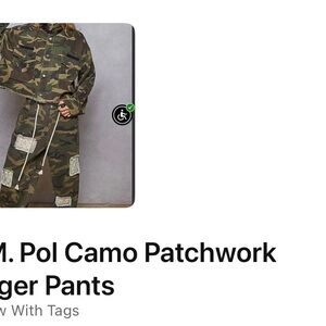 Stylish camouflage jacket and pants set. Features a unique patchwork design. Perfect for a bold look.