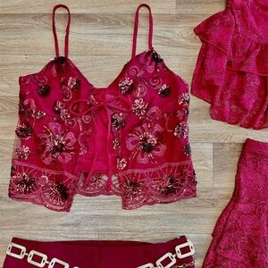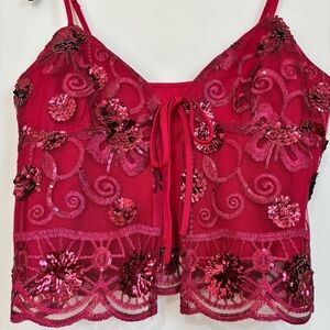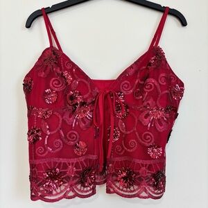 SHEIN Y2k Fairycore Cami Top Embroidery Mesh Babydoll Red Sequin Tie Front Small