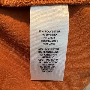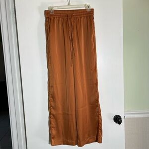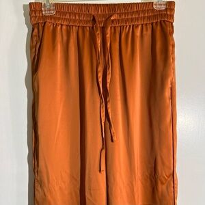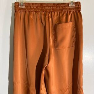 Chic wide leg pants by Elie Tahari. Rich rust color. Fabric is stylish, shiny, silky satin with a beautiful slimming hang. Measurements waist 13.5” unstretched, inseam 30”. Effortless style and comfort.
