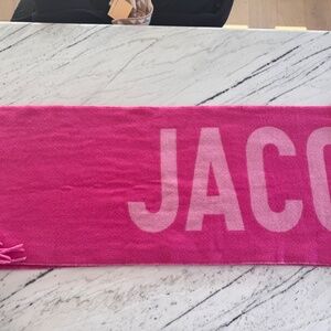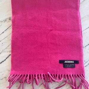 Iconic Jacquemus scarf featuring fringe trim and bold logo detailing. Soft wool blend feel with a luxe, oversized silhouette â the perfect statement winter accessory.