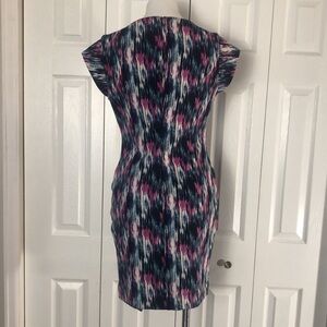 Attention Cap Sleeve Multicolor Hi Low Fitted Dress in Fuchsia various Blues White. The longest point is approximate 37 “ and the sides and back are about 34”. Has hidden back zipper. Crew type neck. Very nice preowned condition. Size M