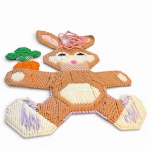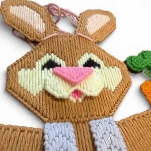 This listing is for a vintage handmade plastic canvas wall hanging featuring a cute Easter bunny rabbit design with a carrot. Measuring 12 inches in height and 9 inches in width, this unique piece is a charming addition to any home decor, showcasing the traditional craftsmanship of plastic canvas art. Made in the United States, this wall hanging is a delightful Easter-themed embellishment for any space.