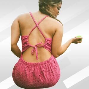 Embrace effortless elegance in the Andie The Roatan Midi Dress in Rosette, Size M. This feminine dress features a beautiful eyelet design, adjustable straps, and a flattering fitted bodice with a breezy midi-length skirt. The soft rosette pink hue adds a romantic touch, perfect for brunch, vacations, or summer gatherings.