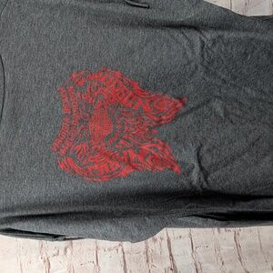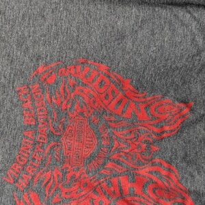 Gray Harley Davidson t-shirt with fringe sleeves and red skull graphic.
