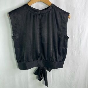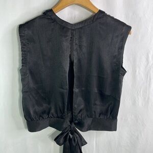 Super cute black top with small keyhole opening in front. If you wear it buttoned and the back is open from neck to waist with a bowtie closure. 100% of this goes. Armpit to armpit is approximately 38 inches. Length approximately 18 inches. Super cute with a full skirt, jeans, over a tank, dress, with cigarette trousers, etc. this could be worn in so many ways🥖