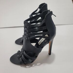 STEVE MADDEN MADELIA Grecian Women's Ankle Strap Edgy Stiletto Heeled Shoe Black Color Back Zip Closure Open Toe Mobwife Whimsigoth Officesiren Y2K