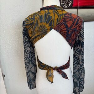 Stylish floral tie-front crop top. Features a mix of blue, orange, and yellow patterns.