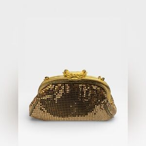 Features signature fluid mesh, the interior has a small slip pocket, and the frame is stamped with the brand logo. The chain can likely be tucked inside to wear as a clutch & has a magnetic snap.