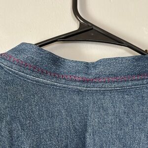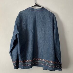Denim vest with vibrant floral and geometric embroidery. Adds a unique touch to any look.