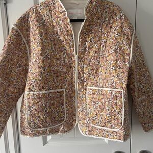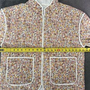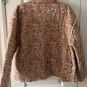 Chic floral quilted jacket with vibrant colors. This floral quilted jacket has an oversized fit, if you prefer a snugger fit I recommend sizing down. The flowery print and quilted texture make it the perfect statement piece for the season.