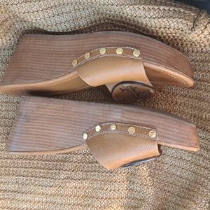 Stylish Tory Burch wedges. Features tan pebbled leather with signature logo.