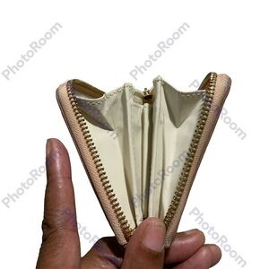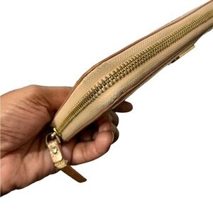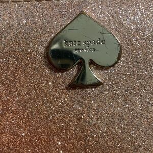 Glittery gold Kate Spade zip-around wallet featuring metallic finish, iconic spade logo, and multiple card slots. Stylish and functional for everyday or evening use.