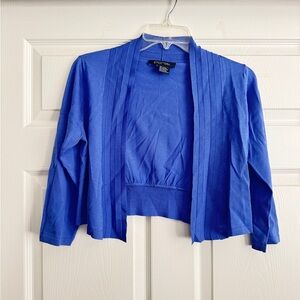 Chic periwinkle cardigan with open front. Ideal for layering.