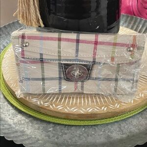 Stylish plaid wallet for women featuring a classic design. Perfect for everyday use. Comes with sturdy wristlet strap. Silver tone hardware. Denim material.
