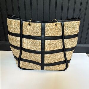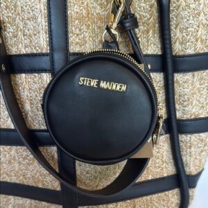 This Steve Madden tote bag showcases a striking geometric design with black straps overlaying a tan woven base. The structured style and sturdy black handles make it both fashionable and functional, perfect for everyday use.