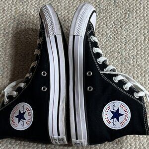 Converse All Star Chuck Taylor Women's black high top sneakers shoes in size 7.5 (USA). Lace up closure. Canvas fabric upper.