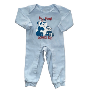 Baby boys one-piece outfit, size 3 months. Brand unknown (tag unreadable). Blue one-piece with snap closure through the middle of the legs for easy diaper changes. Features an adorable front graphic that reads “My Mimi Loves Me” with two panda bears on the chest. Long sleeves and soft fabric, perfect for everyday wear or lounging.