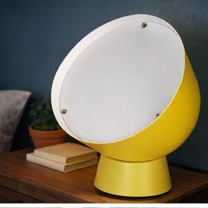 Striking designer Scandinavian table OR wall lamp by Ola Wihlborg, featuring a bold sculptural form with a tilted bowl silhouette. Crafted entirely of painted metal in a vibrant matte yellow finish, with a white metal interior diffuser that casts a warm, ambient glow. Resembling our Sun