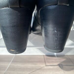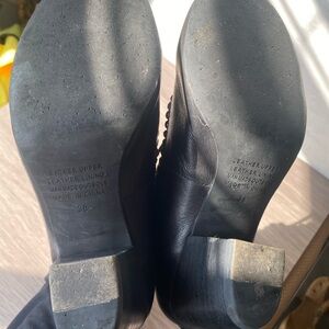 Soft leather, lace up booties with heel. I’ve worn these a couple of times, one of the heels has a little ding, but it does not affect the heel. I love these, but they are no longer my style.