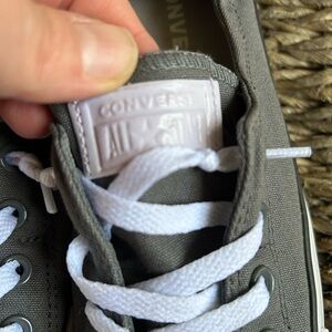 Stylish gray slip-on sneakers with white laces. Perfect for casual wear.