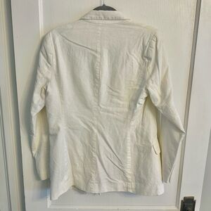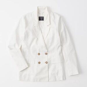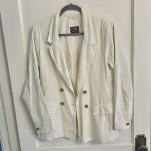 This blazer was purchased from Abercrombie. The blazer is double breasted and has faux pockets, but I’m sure you can take a seam ripper to open them up. The blazer is a size Medium.