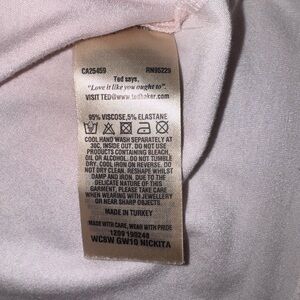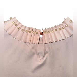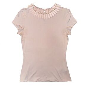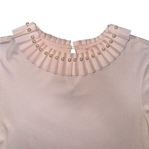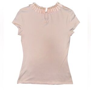 • pale pink fitted t-shirt with ruffled collar and pearl accents