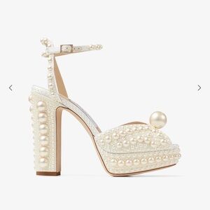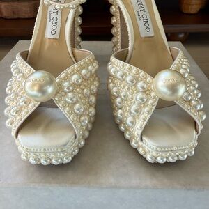 JIMMY CHOO White Satin Pearl Bridal SACARIA 120 Platform Heels 39/8, In Box, A++