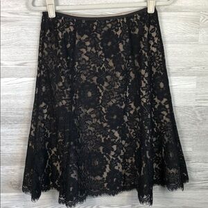 Ann Taylor Black Lace A-Line Midi Skirt Romantic. Pretty black lace over nude lining. Side zipper and eye hook closure.