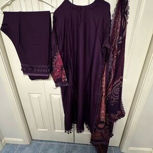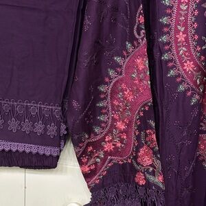 Elegant purple suit set with intricate pink embroidery. Perfect for special occasions.l