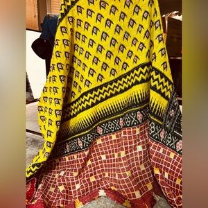 Vibrant fabric with intricate patterns. Features blue, green, red, and gold hues about the size of a twin quilt