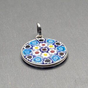 Vibrant Murano glass millefiori pendant featuring a blue and white floral mosaic framed in sterling silver. The silver bail adds a polished finish, making it perfect for chains or charm necklaces. A lovely artisan-made piece with classic Venetian style and excellent pre-owned condition.