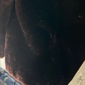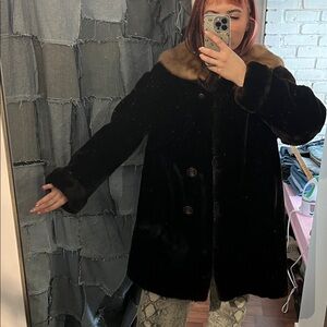 Stay warm and stylish with this elegant black coat featuring a luxurious brown fur collar. Perfect for any occasion.