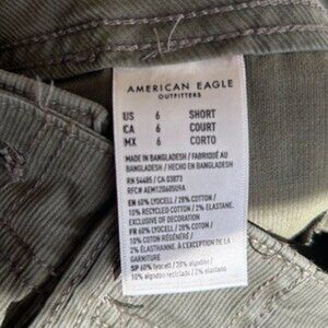 American Eagle Stovepipe Leg, Stretch Green Pants, NWOT. Material is army green color in a ribbed fabrication with stretch, lots of recovery. 2 front slant pockets with buttons, 2 back patch pockets and tabs on the waist to cinch in should you need to. Size is 6 short.
