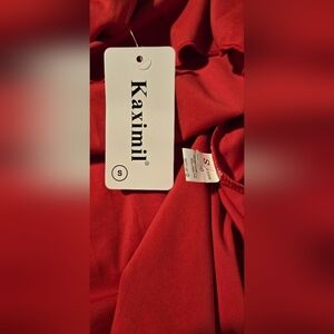 This striking red dress features a flattering square neckline and long sleeves, perfect for a night out. The fit and flare design, with a ruched waist, creates a balanced and elegant silhouette. Its vibrant color and modern style make it a standout choice for any cocktail event.