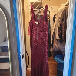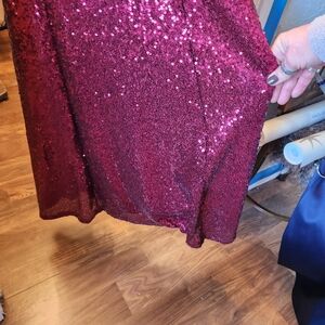 Stunning burgundy sequin gown with a deep V-neckline. Perfect for formal events.