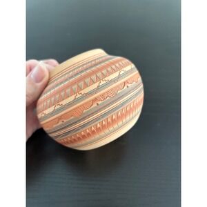 Navajo etched seed pot by artist Myron Charlie showcases intricate geometric patterns and traditional southwestern earth tones. Handcrafted with a matte finish, this small pottery piece features fine-line sgraffito details including stepped clouds and mountain motifs. The underside is signed by the artist and marked Navajo. There is a small chip on the inner rim, as visible in the photos.