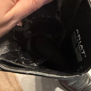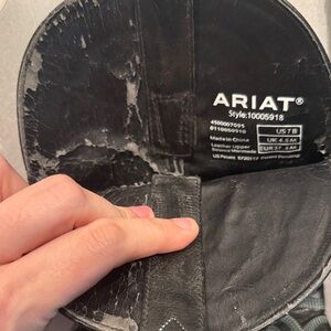 Stylish Ariat heeled boots. Black leather with blue embroidery. Perfect for any occasion. Leather is peeling on the interior.