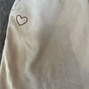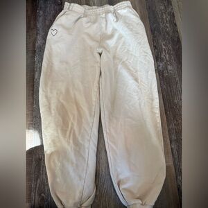 100% cotton. Has a bleach stain at the bottom on the joggers. Price reflects. Cozy beige loungewear joggers. Ideal for relaxation.