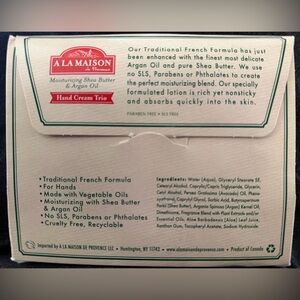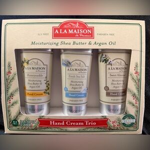Indulge in the Hand Cream Trio featuring Honeysuckle, Fresh Sea Salt, and Sweet Almond. Each cream is enriched with moisturizing shea butter and argan oil.