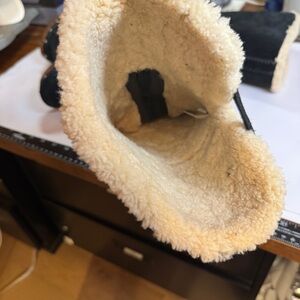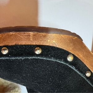 UGG black suede knee-high boots with cozy shearling lining and a distinctive wood-look stacked heel. Features a rounded toe, studded platform sole, and a partial inner side zipper that does not extend to the top. Suede upper with plush shearling interior for warmth and comfort. Marked women’s US size 8 (EU 39). Bold cold-weather style that pairs well with denim, leggings, or skirts. Good used condition with some wear to the wood look heels and platforms. I love offers!
