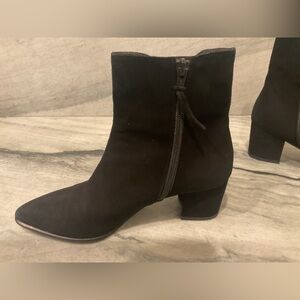 Elegant black suede ankle boots with side zipper. Perfect for versatile styling. Very light wear as shown. Very pretty boots.