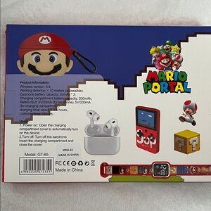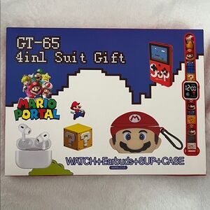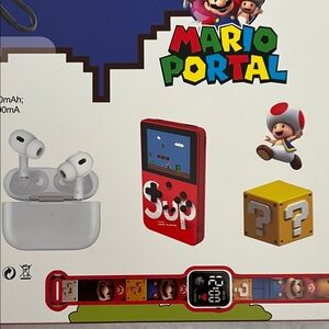 Mario Portal 4-in-1 gift set with watch, earbuds, SUP, and case. Features vibrant red and blue colors.