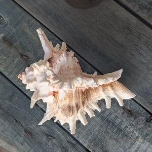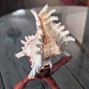 Elegant Ramose murex seashell displayed on a wooden tripod stand. Perfect for home decor as a statement piece. See pictures for measurements of this large murex.